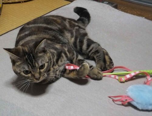 某猫雑誌のふろく。当初は見向きもしなかったくせに、今では結構なお気に入りです。ヒトと遊ぶときは両端に付いたじゃらしとポンポン、一匹で遊ぶときはヒモにじゃれてます。 気に入らなかったからと直ぐに捨てたらダメですよー!
