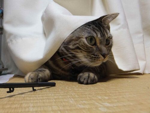 家族じゅうからからダメ!ダメ!と何度叱られても絶対やめない虎娘の悪い子行動はいくつか(涙)ありますが、その一つがカーテンの裏に入り込むこと。いえ、入ってるだけならまだいいのですが、裏でジャンプはするは引っかくわで、カーテンもうヨレヨレです(汗…