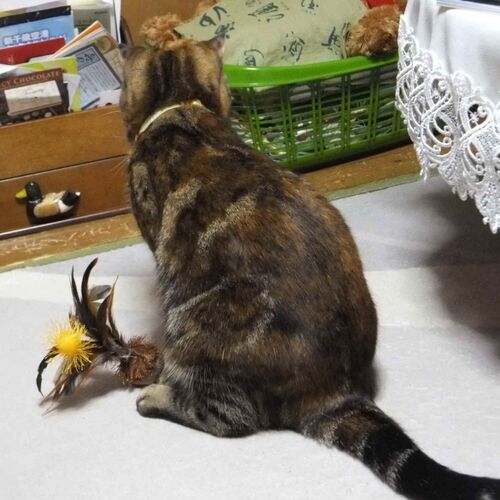 羽根じゃらしは追い掛け回すより噛み付くのが好きな虎娘。 ヒトドモが居なくても遊んでくれるので楽なのですが、それだと棒付きは危ないので、羽根のおもちゃを買ってあげました。 で、気に入って遊んでくれたのはいいのですが、 そう、羽根も茶色なので同化…