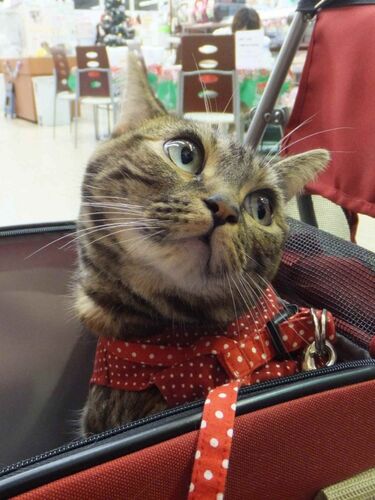 昨日の定期診察待ちの様子。最近は呼ばれるまでカートの中で大人しく待っています。 …診察前で緊張気味とも言いますね(汗)。Ka-chiと二人話しかけたり頭撫でたり、カートを押して回って気分転換させています。