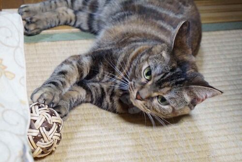一生懸命オモチャで時間稼ぎするも察してるのかノリの悪い虎娘。 お休み前のおやつ時間までもうちょっと待っててね。