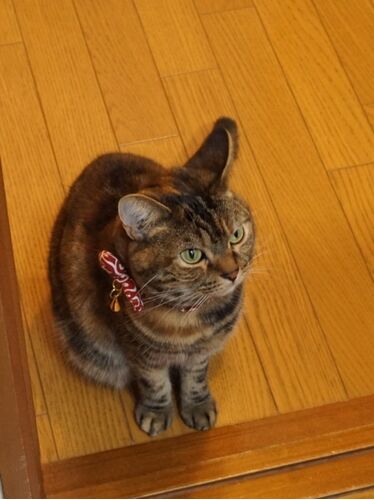 パソコンいじっている傍らできっちりお座りして延々こちらを見ている虎娘。 ものすごい意思を感じますが、遊ぶ?ご飯?おやつ?お水?と聞いても微動だにせず。うーん、会話できればいいんですけどねえ。