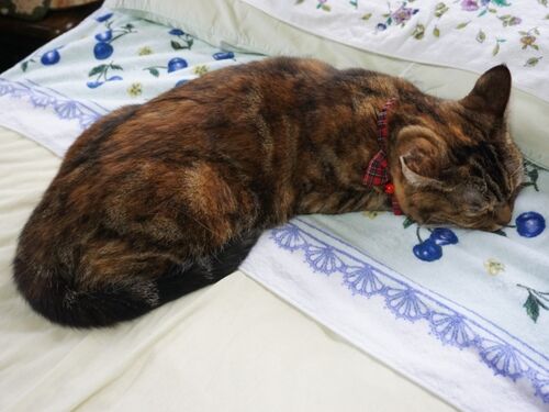ブログを書いている今は台風で外が賑やか(汗)ですが、昼間はまだそれほどではなく…。 マイベッドをがっつり占領して熟睡する虎娘。 幸せそうねえ…(←ほだされている) …そして今、寝付いては風にびびって起きております。頑張れ。